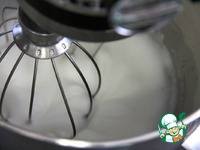 Яичные белки хорошо взбиваем до устойчивых пиков. Добавляем сахарную пудру и взбиваем еще немного.