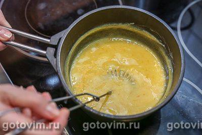 Перелить желтки в ковш с цитрусовым соком и сахаром, размешать и поставить на водяную баню.