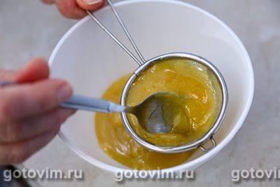 Загустевший крем протереть через мелкое металлическое сито, чтобы избавиться от цедры и прочих крупинок в готовом курде.