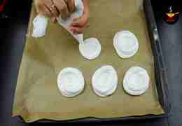 Теперь меренгу я перекладываю в кондитерский мешок, отрезаю кончик, противень застилаю пергаментной бумагой и делаю мини-пироженки.