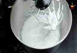 Сперва нужно сделать меренгу. В чашу миксера я вливаю белки. Белки я использую комнатной температуры. Всыпаю сахарную пудру,