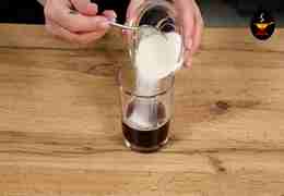 В горячее кофе высыпаем 20 г быстрорастворимого желатина (силой 220 Блюм). Тщательно размешиваем до растворения.