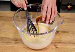 Выливаем тонкой струйкой кофейную смесь в ряженку