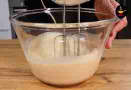 и взбиваем миксером 3-5 минут. Масса должна стать пышной и покрыться мелкими пузырьками – именно они сделают десерт «воздушным».