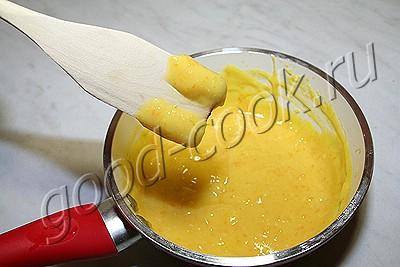 Остудить массу до комнатной температуры. Для сокращения времени остывания кастрюльку с апельсиновой помадкой можно поставить