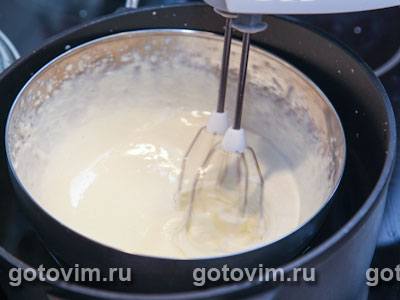 взбивать миксером, пока желтковая масса не станет бледно-желтой. Постепенно добавить сахар и продолжать взбивать миксером до образования густой, однородной массы.