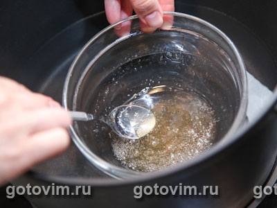 Желатин пересыпать в небольшую миску, влить 2-3 ст.л. воды и оставить набухать на 40 минут. Желтки отделить от белков (белки оставить для другого рецепта),