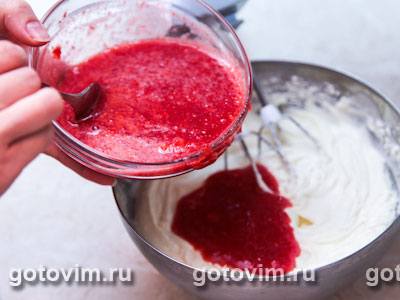 Переложить клубничную массу в желтковую смесь с маскарпоне. Хорошо размешать.