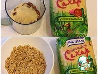 На сухой сковороде поджарить орехи до появления слегка коричневой корочки. В чаше миксера смешать орехи, половину коричневого сахара и