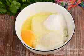 Для начинки в миску выкладываем творог, яйцо, сахар и манку. У меня творог влажный в пачке. Если берем зерненый творог, то протираем через сито.