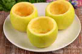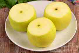 Со стороны плодоножек срезаем у яблок небольшие части. С нижней стороны подрезаем выступающие части, чтобы яблоки ровно стояли на тарелке.