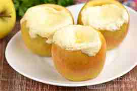 Время приготовления зависит от твердости яблок, так как начинка уже готова (ей надо 4 минуты). Яблоки с творогом можно запечь и в духовке, по времени будет дольше.