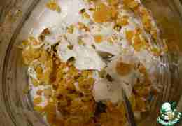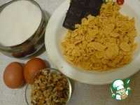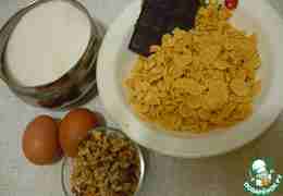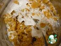 Белки взбить с сахаром до твердых пиков. Добавить орехи, кукурузные хлопья и перемешать.