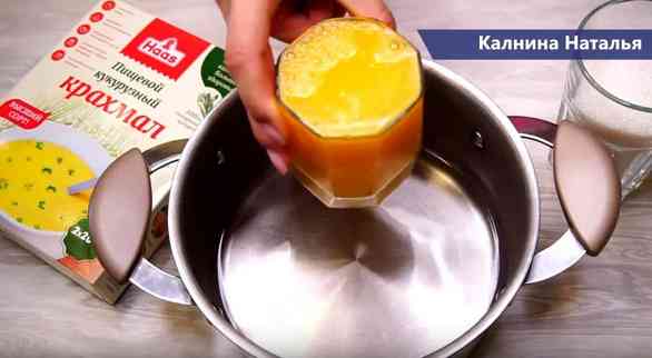 Добавляем 300 грамм сахара, и 140 грамм кукурузного крахмала. Все хорошенько перемешиваем и ставим на огонь.