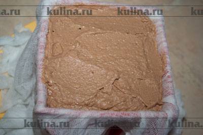 Подготовленную массу выложить в пасочницу, выстланную влажной марлей.