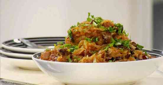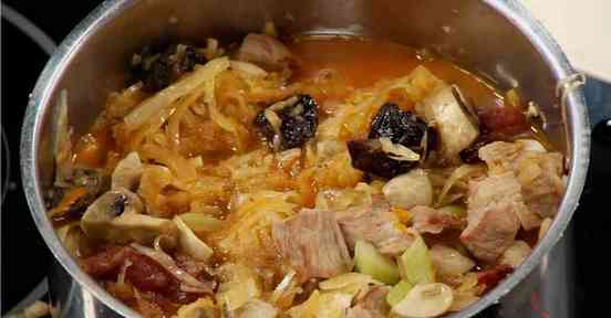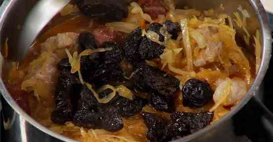 В бигус вливаем полстакана мадеры, добавляем лавровый лист, солим. Тушим 1,5-2 часа. Затем снова добавляем полстакана мадеры. Тушим еще