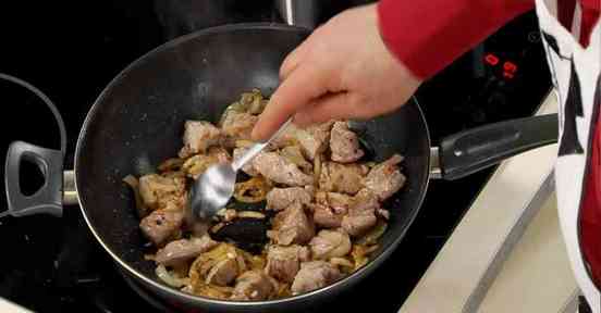 Лук нарезаем на четверть кольца, свинину – средними кубиками. В растительном масле обжариваем лук и выкладываем на него свинину.