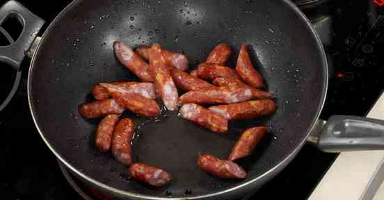 Охотничьи колбаски нарезаем крупными кусочками, обжариваем на сковороде с добавлением масла, выкладываем на бумажную салфетку,