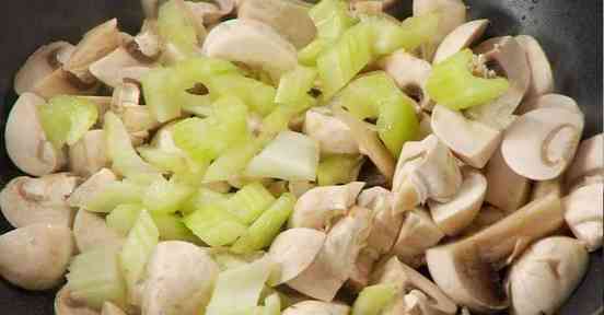 Шампиньоны режем небольшими кусочками и обжариваем с сельдереем, нарезанным пластинами. Выкладываем в кастрюлю.