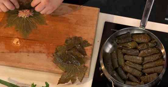 Разрезаем 10 маслин пополам. Кладем на противень. Ставим в духовку. Промываем листья винограда. Выкладываем фарш на листья
