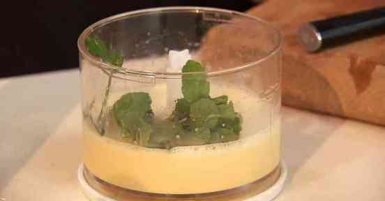 Готовим соус. Взбиваем яйца. Добавляем растительное масло и соль. Продолжаем взбивать. Добавляем чеснок и мяту. Измельчаем.