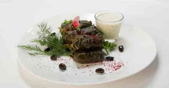 Кладем соус в соусник. Ставим на тарелку. Выкладываем долму на тарелку. Украшаем вялеными маслинами, зеленью и перцем чили.
