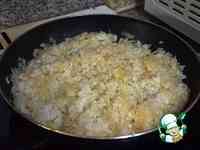 Добавить готовый рис, перемешать, прогреть вместе пару минут, отставить, чтобы смесь остыла.