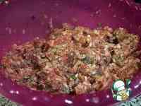 Смешать фарш и кинзу, посолить, поперчить, перемешать.