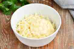 Сыр измельчаем на крупной терке и добавляем майонез.