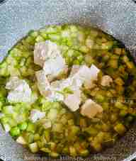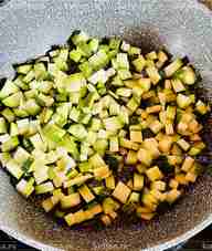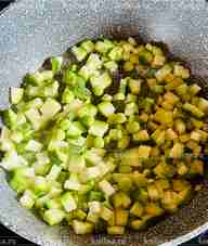 В сковороде разогреть небольшое количество растительного масла. Молодой кабачок с тонкой кожицей нарезать мелкими кубиками, выложить в