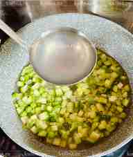 Взять половник жидкости и вылить в сковороду.
