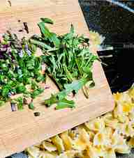 Выложить руколу и мелко нарезанный зеленый лук, перемешать.
