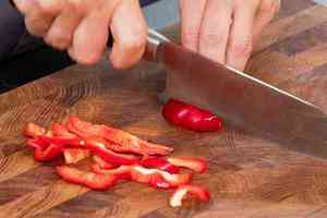 Болгарский перец освободите от «верхушки» и семян. «Верхушки» нарежьте соломкой и добавьте к зажарке в сковороду.