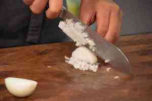 Репчатый лук нарежьте мелким кубиком. Зубчик чеснока раздавите ножом, мелко нарежьте и отправьте к луку.