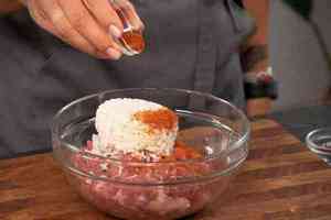 Подготовьте начинку для перцев: в миске смешайте фарш, круглый отварной рис, сумах, половину паприки,