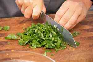 Зелень мелко нарежьте и отправьте к начинке из фарша и риса.