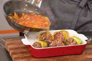 Начинку из фарша тщательно перемешайте. Щедро наполните каждый перец и выложите в жаропрочную форму.