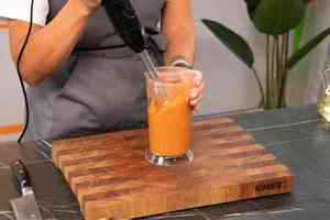 Готовые перцы переложите на отдельную тарелку. Весь бульон с овощами перелейте в чашу блендера и тщательно взбейте.