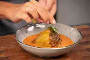 Овощной соус налейте на дно тарелки, сверху выложите перцы.
