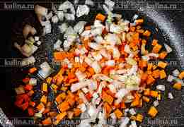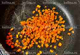 Морковь нарезать мелким кубиком. В сковороде разогреть растительное масло, выложить морковь, слегка обжарить.
