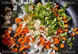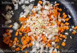Чеснок измельчить, выложить в сковороду.