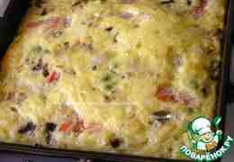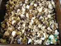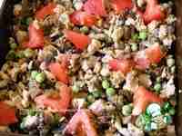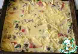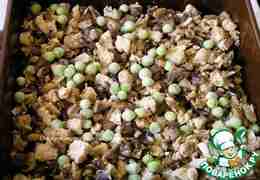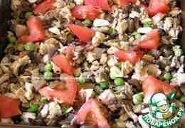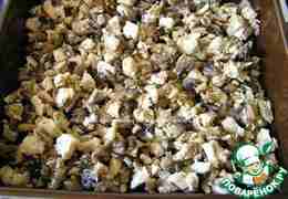 нарежьте. Смешайте грибы и куриное филе, выложите в смазанную маслом форму для запекания.