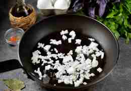 Разогрейте в сковороде растительное масло, обжарьте на нем нарезанный репчатый лук до прозрачности.