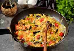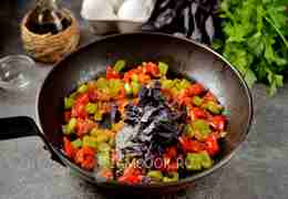 Влейте взбитые яйца, помешивайте лопаткой до тех пор, пока яичная масса не приготовится полностью. В сковороде должна образоваться яичная кашица с овощами.