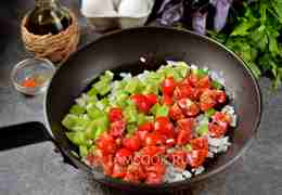 кубиком, переложите в сковороду и жарьте на умеренном огне минуты 3-4. Вместо помидоров черри можно использовать любые крупные, но желательно снять с них кожуру.