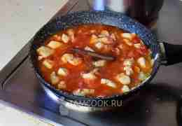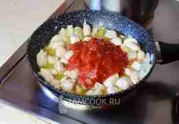 После этого добавляем томаты в собственном соку, которые нарезаны кубиком.