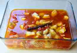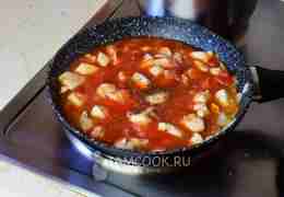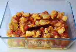 Затем выкладываем в форму приготовленное ранее куриное филе в томатном соусе.