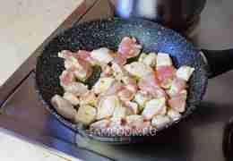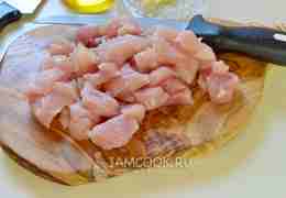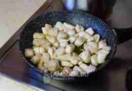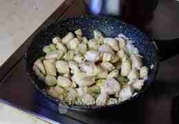 Обжариваем куриное филе на сильном огне 4-5 минут, помешивая, чтобы мясо немного побелело, но не подрумянилось.