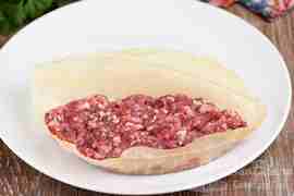 Накрываем фарш второй половиной листа, получается плоское не очень толстое изделие похожее на шницель. Муку смешиваем с крахмалом.