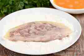 За счет крахмала панировка не будет отслаиваться. Обваливаем шницель в муке с крахмалом.